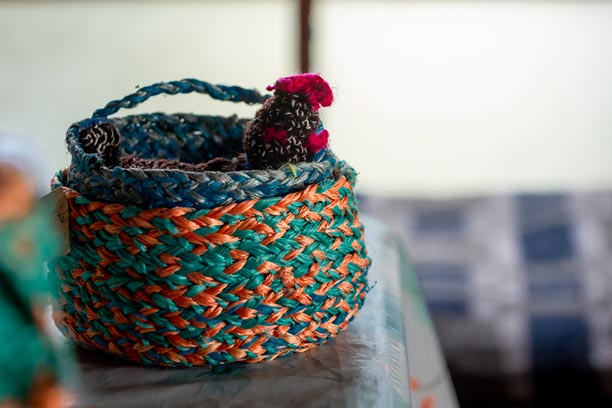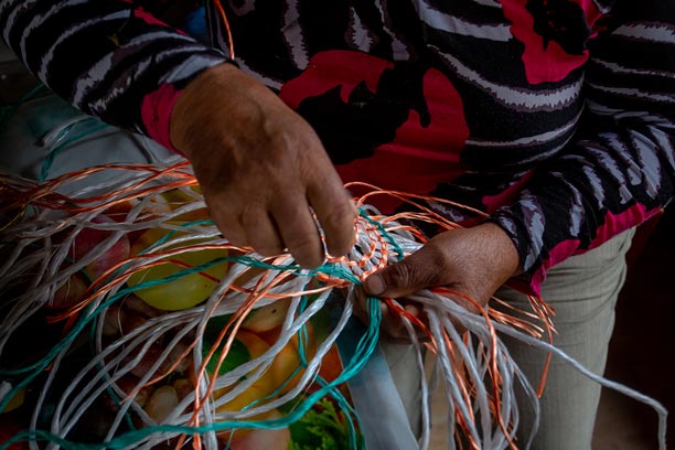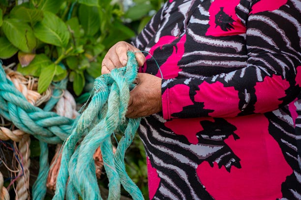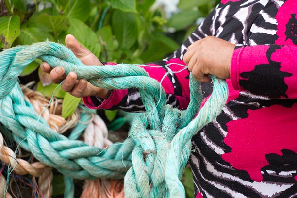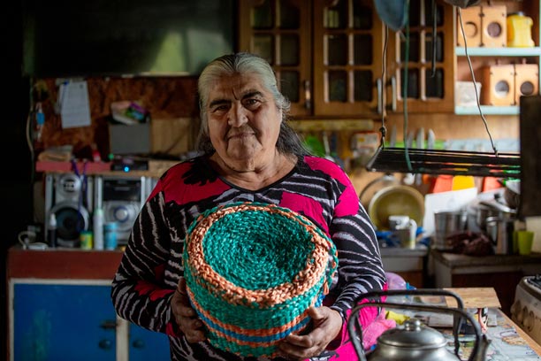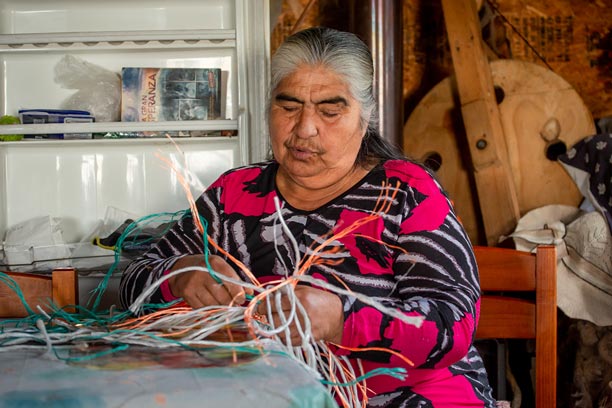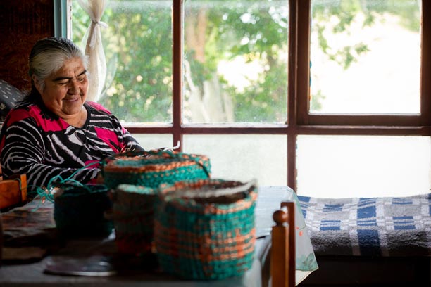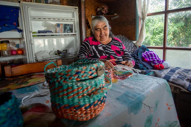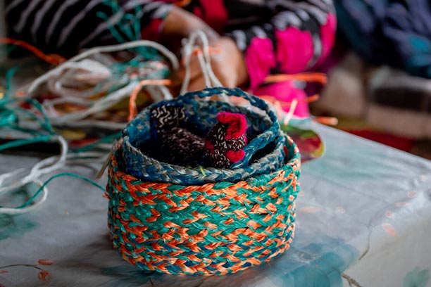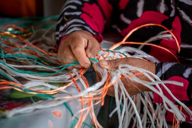 En la Península de Comau, los oficios tradicionales se reinventan a partir del entorno. Una de nuestras socias desarrolla un trabajo artesanal único utilizando cuerdas plásticas en desuso provenientes de la actividad pesquera local. Con paciencia y creatividad, estos materiales son transformados en canastos, tejidos y piezas utilitarias que combinan identidad territorial, reciclaje y oficio.
